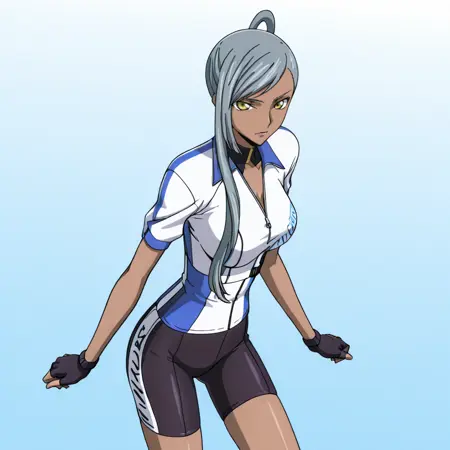 • 트리거: VillettaNu, 1girl, black thighhighs, dark-skinned female, dark skin, grey hair, yellow eyes, zettai ryouiki, sleeves rolled up, ponytail