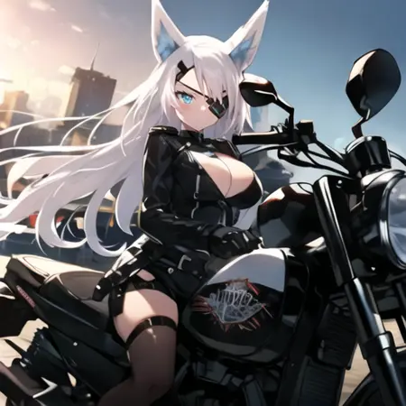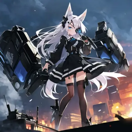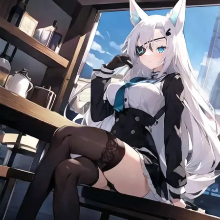 1. 1girl, solo, AG Sirius, 안대, 여우 귀, 여우 꼬리, 파란 눈, 흰색 머리, 긴 머리, 머리 장식, 허벅지 긴 양말, 검은 치마, 중간 크기 가슴, 무기, 팬티,