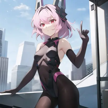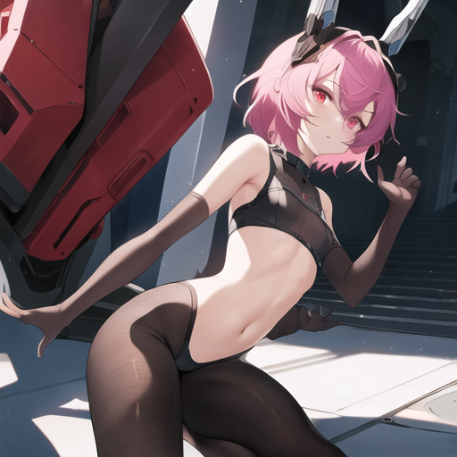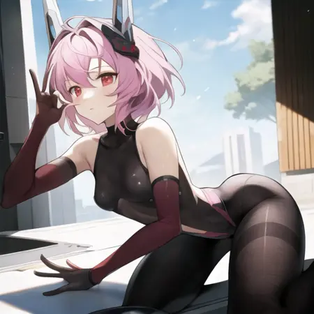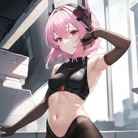 1girl, AG Rela, 短发, 粉色头发, 连裤袜, 黑色手套, 头部装备, 体操服, 连体衣, 红眼睛, 小胸, 娇小, 成年, 暴露腹部,