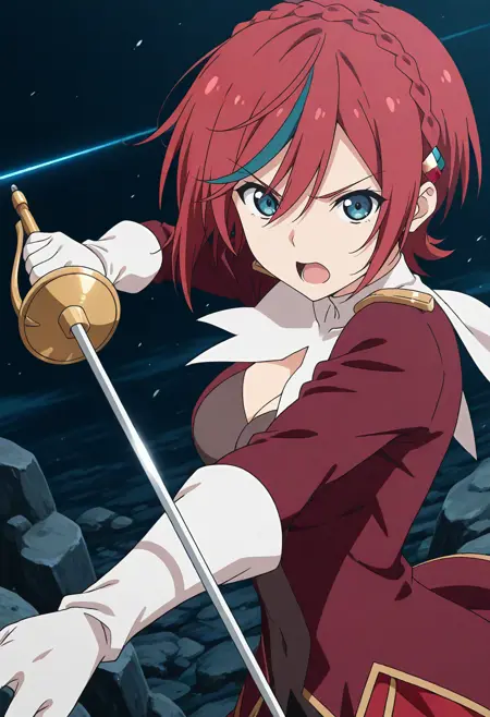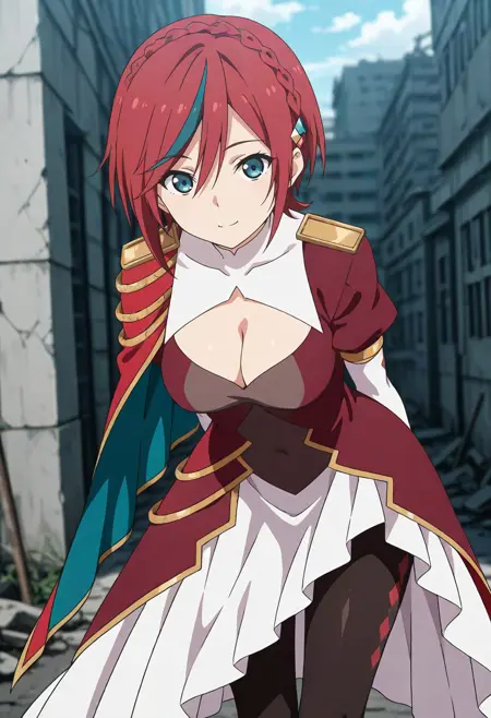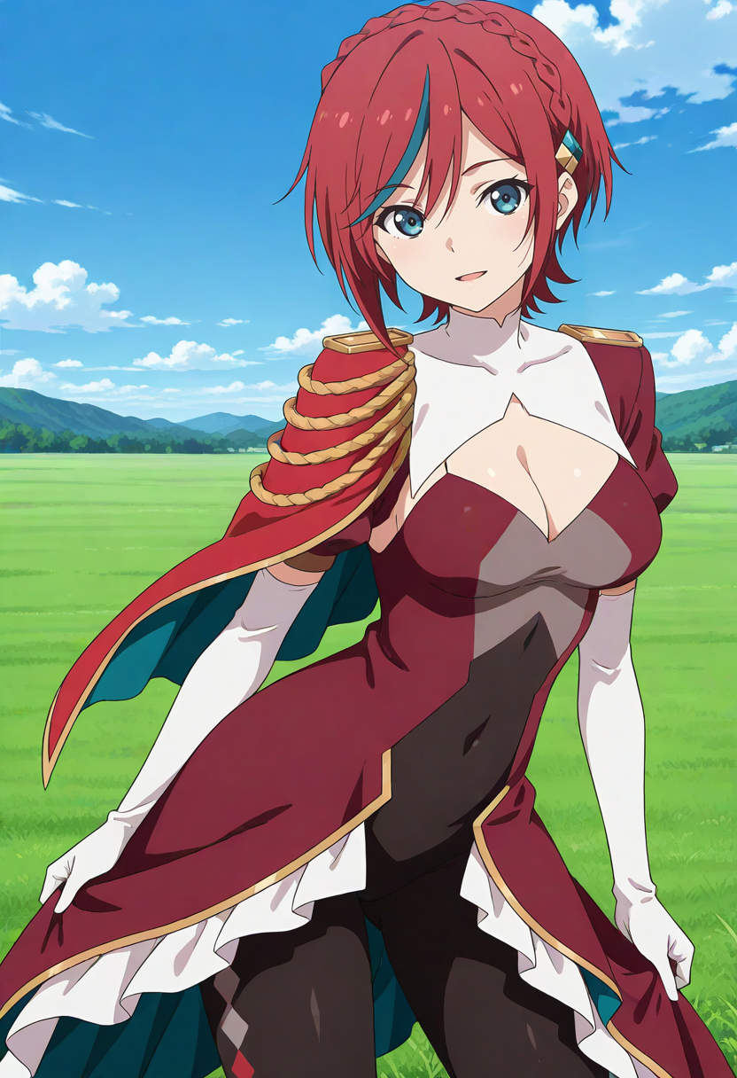 髪型など(必要に応じて):赤髪、ショートヘア、青い目、青いストライプ髪、クラウン編み、ヘアオーナメント