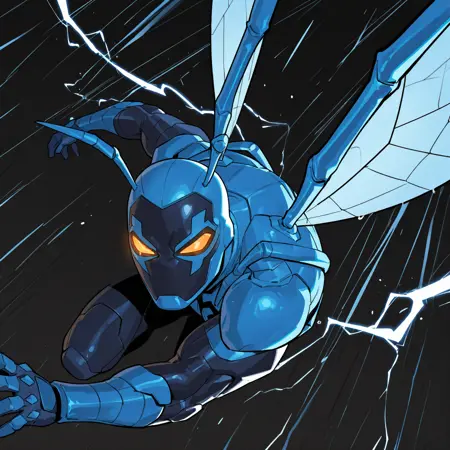 blue_b, solo, short hair, black hair, 1boy, male focus, teeth, wings, dark skin, hair over one eye, armor, torn clothes, muscular, blood, bodysuit, glowing, muscular male, pectorals, dark-skinned male, squatting, motion lines, clenched teeth, claws, blood on face, injury, black bodysuit, on one knee, glowing eye, insect wings, bruise, blue bodysuit, blue wings, blood from mouth, cuts, torn bodysuit, scratches, light trail, arm blade, two-tone bodysuit, grey bodysuit, eye trail, hand on ground, brown eyes, horns