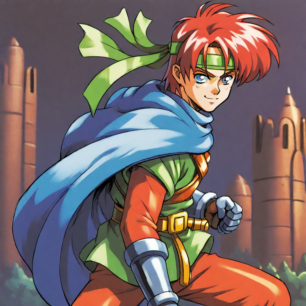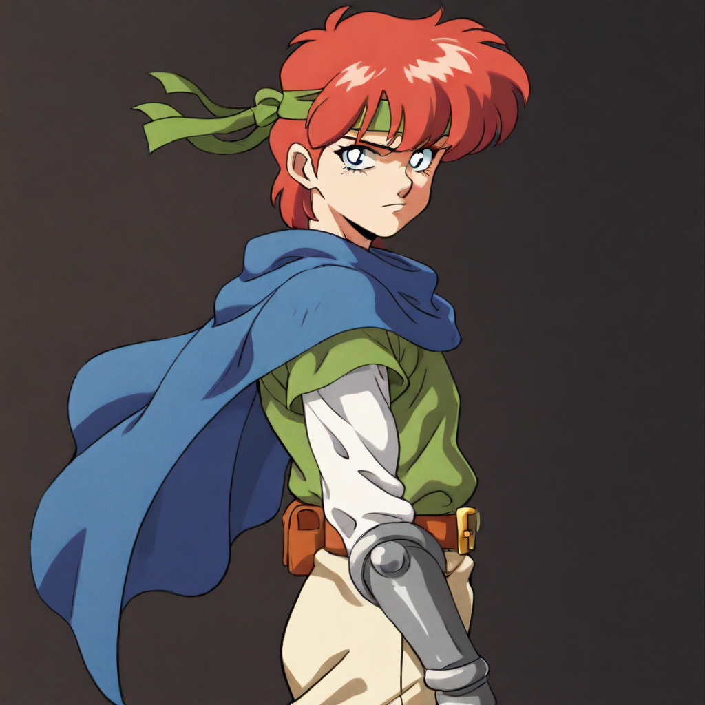"max_sf1,1male,blue dreamy eyes,blue cape,green headband,smile,green shirt,red long-sleeved undershirt,strong chin,gauntlets,"