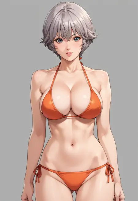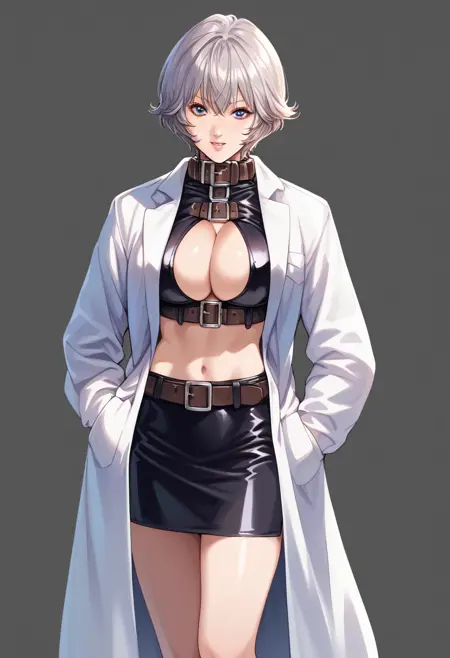 Trigger: suzuneari, short hair, gray hair female, large breasts, collar, cleavage, midriff, skirt, belt,