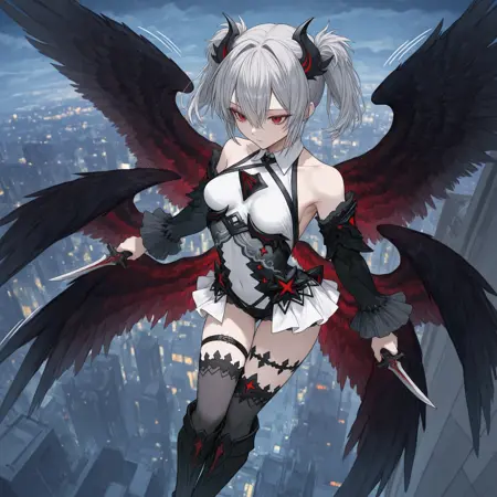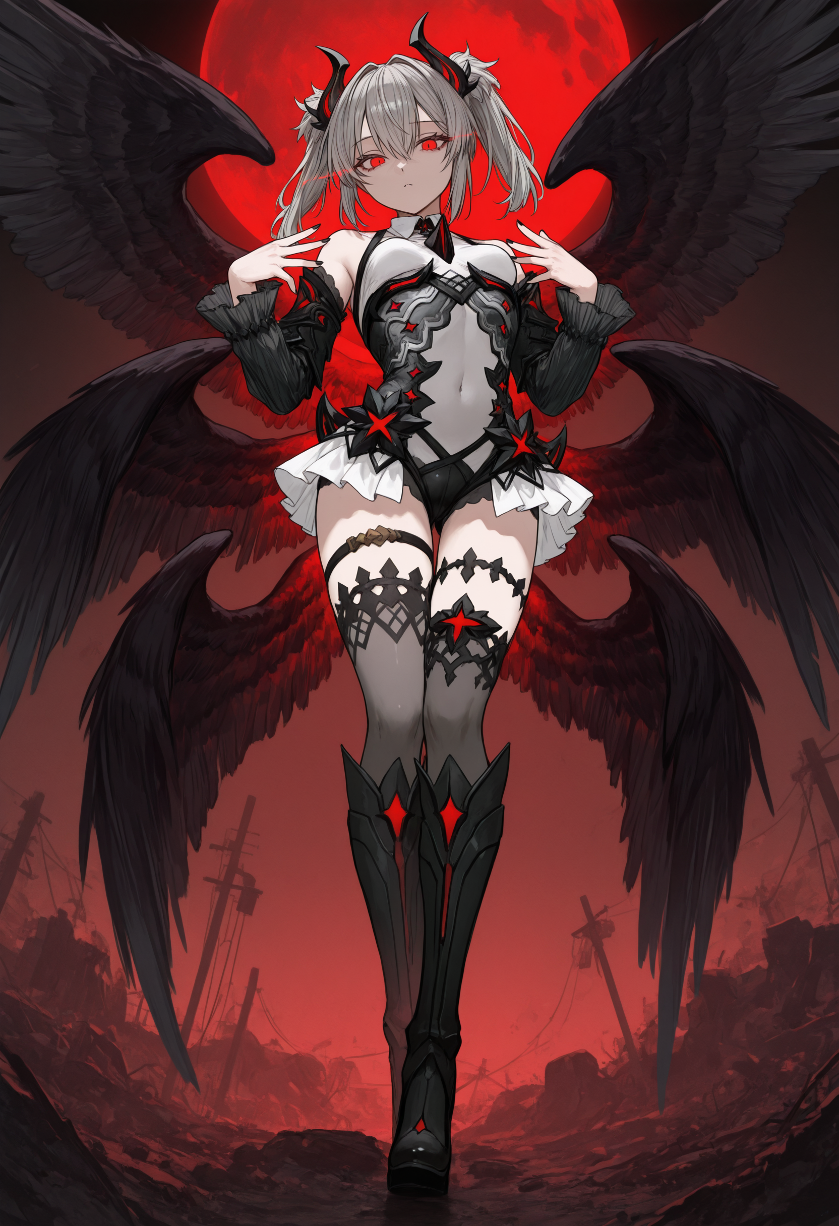 ilith awaken,grey hair,red eyes,horns,feathered wings,black wings,red wings,(multiple wings:1.3),twintails,hair between eyes,bangs,short hair,bare shoulders,arm armor,frilled cuffs,medium breasts,leotard,covered navel,detached sleeves,jacket,clothing cutout,thigh strap,black thighhighs,knee boots,asymmetrical legwear,