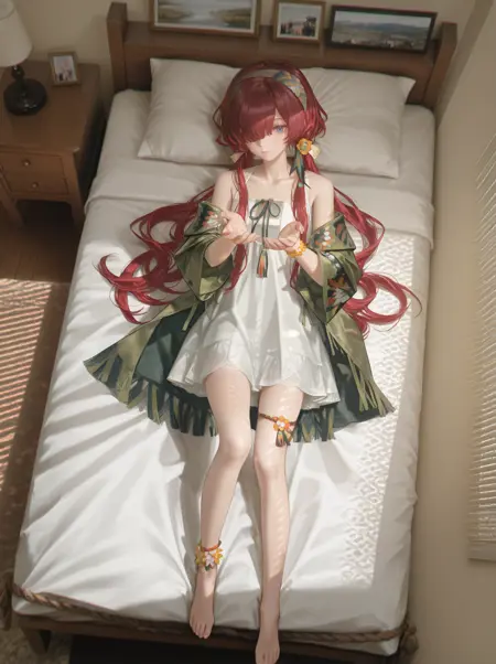 태그: xyns3, 비대칭 앞머리, 붉은 머리카락, 낮은 트윈테일, 긴 머리카락, 한쪽 눈을 가린 머리카락, 파란 눈, 머리띠, 머리 장식, 깃털, 꽃 팔찌, 로프, 흰 드레스, 소매 없는 드레스, 짧은 드레스, 절개, 어깨 노출, 녹색 코트, 플로럴 프린트, 허벅지 스트랩, 꽃 발목장식, 보석,
