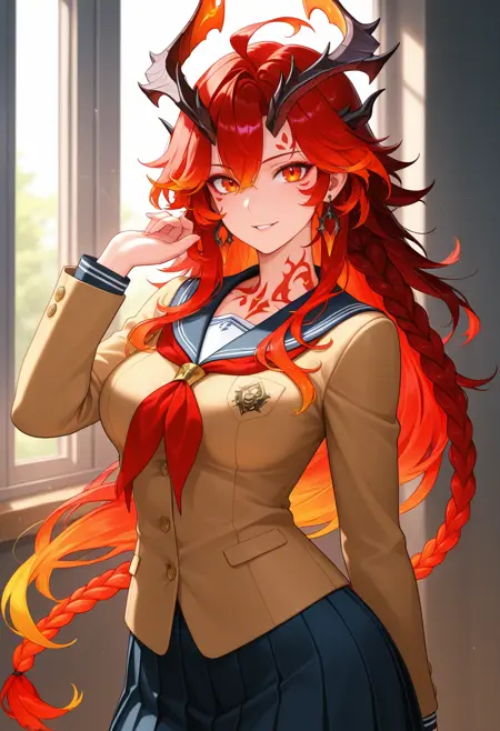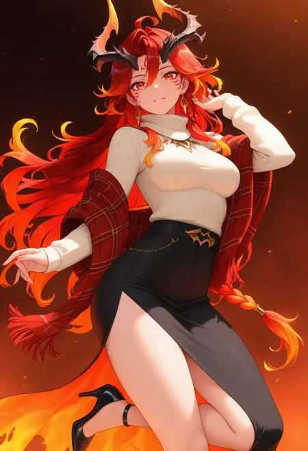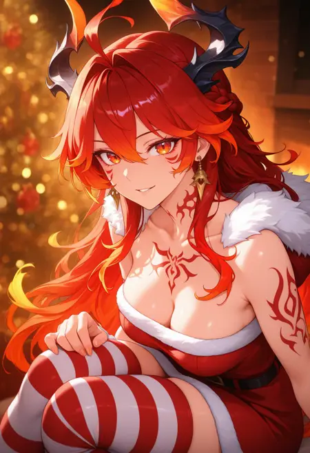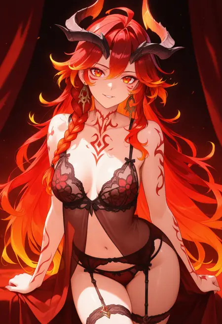 kahlor_nekoforge,1girl,red hair,long hair,gradient hair,multicolored hair,braid,ahoge,hair between eyes,red eyes,orange eyes,medium breasts,horns,tattoo,facial mark,earrings,jewelry,