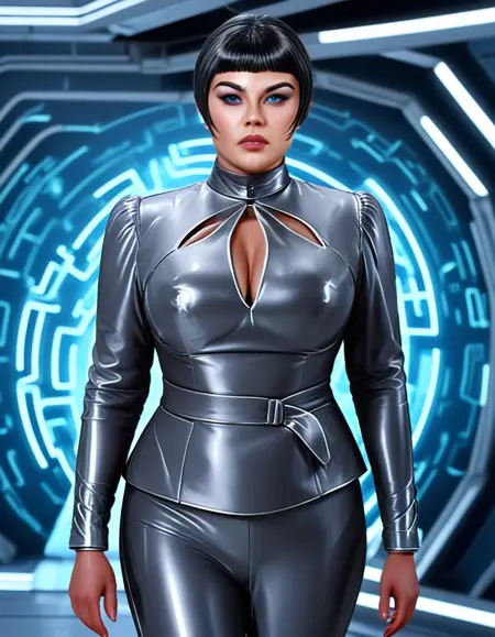 A spandex two-piece dress with a cinched belt. Original has three cutouts and a high collar and it helps to prompt these. (Or experiment with prompting and see what you get —usually some sort of cutout or plunging neckline.) I cropped the faces out of the training images, but the model had dark skin, which in the Flux lora remained elsewhere in the training pics and tends to bleed over to the face in the lora. So "pale white skin" should be prompted in Flux if that's what you want as well.