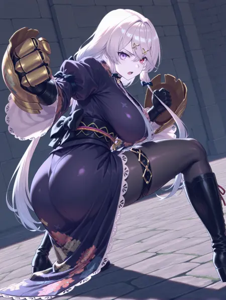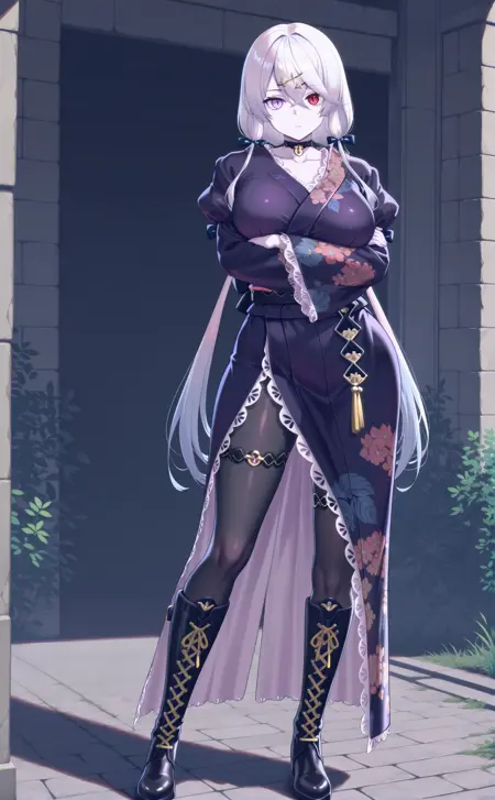 복장 트리거 단어: 일본 복장, 진한 보라색 김ono, 플로럴 프린트 김ono, 초커, 오비, 검정 스타킹, 허벅지 스트랩, 무릎 부츠, 검정 부츠, 끈 매듭 부츠