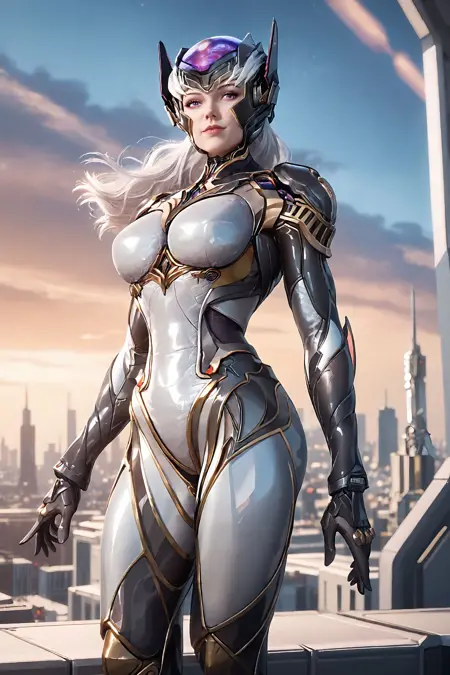 1girl, solo, white hair, purple eyes, bodysuit, helmet, armor