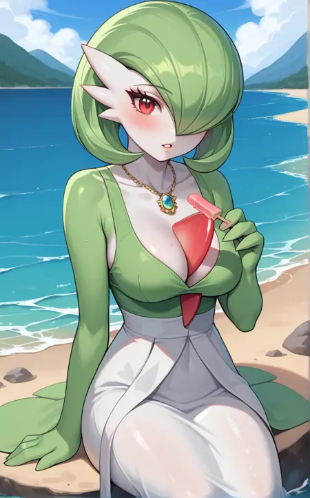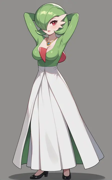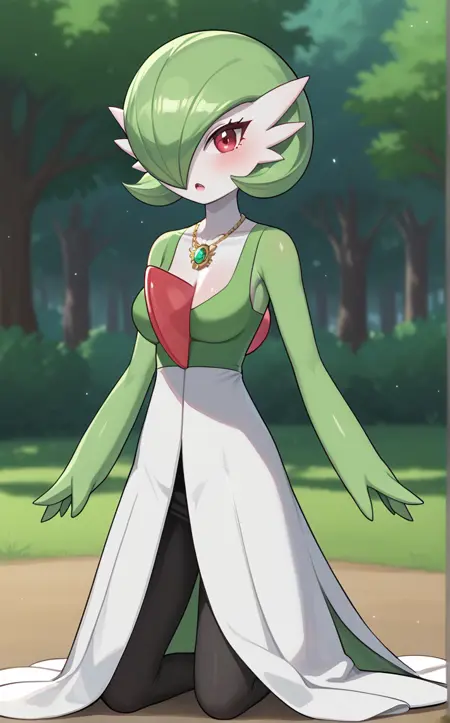 MainOutfit_Gardevior_ownwaifu, 1girl, white skin, big eyes, breasts, bright pupils, colored skin, furry female, gardevoir, green hair, green tank top, long skirt, pointy ears, pokemon (creature), red eyes, short hair, two-tone dress, two-tone skin, white skirt, bob cut, bangs, hair over one eye, one eye covered, shiny hair, jewelry, necklace, hair between eyes, 1other, split mouth, collarbone, white pupils, gem, shiny skin, sideways mouth, cleavage, clothed pokemon, detached collar, no humans,