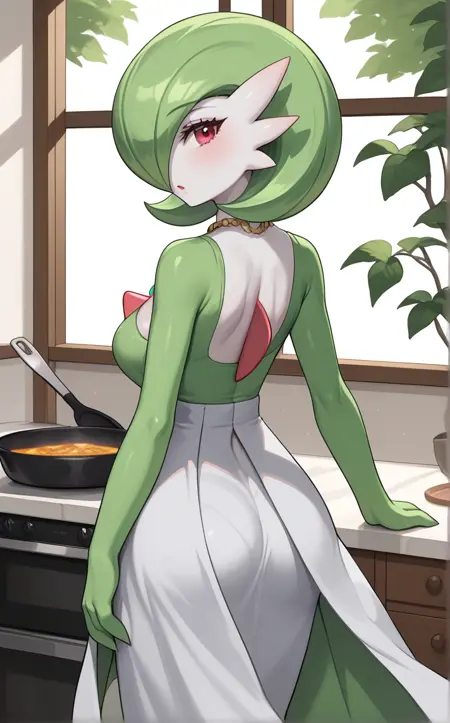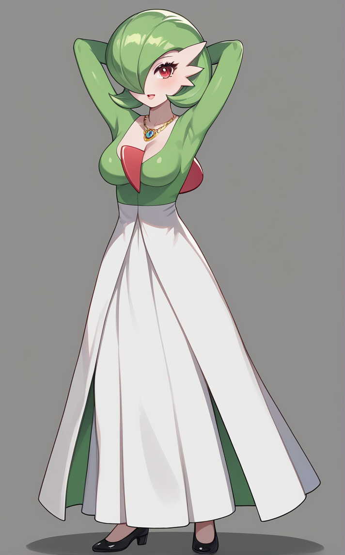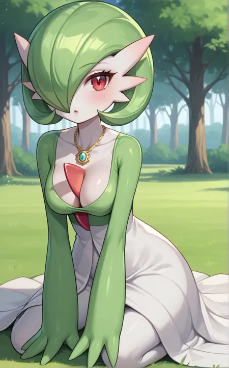 NSFW_Gardevior_ownwaifu, 1girl, breasts, colored skin, furry female, gardevoir, green hair, pointy ears, pokemon (creature), red eyes, short hair, two-tone skin, white skin, bob cut, bangs, hair over one eye, one eye covered, shiny hair, nipples, shiny skin, large breasts, pussy, completely nude, medium breasts, bright pupils, nude, white pupils, hair between eyes, constricted pupils, split mouth, colored eyelashes, colored nipples, elbow gloves, green gloves,