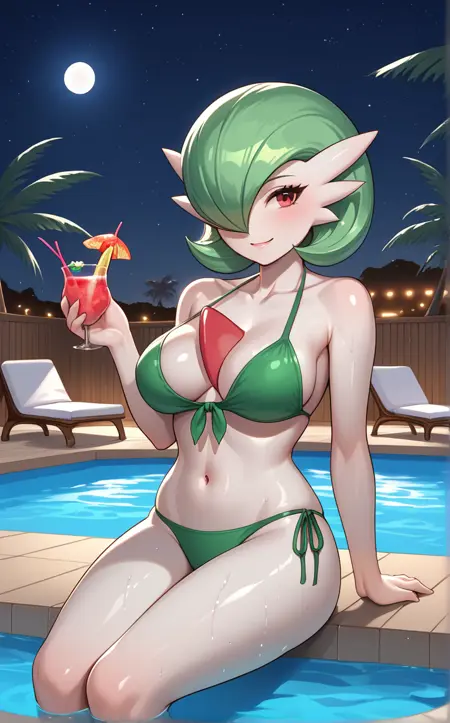 Bikini_Gardevior_ownwaifu, 1girl, bangs, bare shoulders, bob cut, breasts, collarbone, colored skin, furry female, gardevoir, green bikini, green hair, hair over one eye, medium breasts, one eye covered, pointy ears, pokemon (creature), red eyes, shiny hair, short hair, split mouth, two-tone skin, white skin, green panties, navel, strapless bikini, swimsuit, thighs, clothed pokemon, shiny skin,