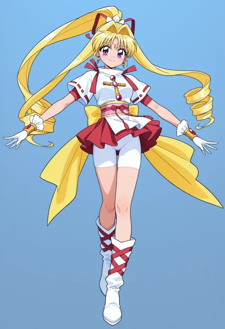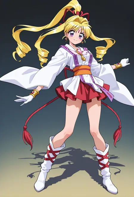 magical girl, red hair ribbon, circlet, earrings, jewelry, japanese clothes, long sleeves, wide sleeves, brooch, sash, bracelet, white gloves, red back ribbon, red skirt, strappy boots