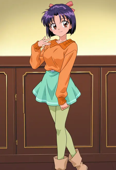 주황색 스웨터, 긴 소매, 아쿠아 스커트, 녹색 팬티스타킹, 부츠