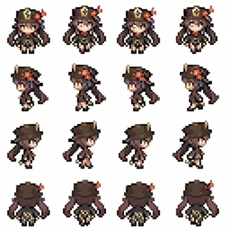 pixel_character_sprite, pxlchrctrsprt, sprite, sprite sheet, sprite art, pixel, (pixel art:1.5), retro game, retro, vibrant colors, pixelated, multiple views, concept art, (chibi:1.5), from side, looking away, from behind, back, white background, <lora:pixel_character_sprite_illustrious:0.7>