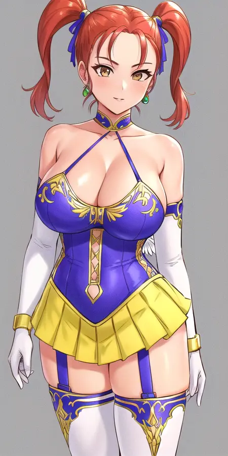 Blue_leotard_Yellow_microskirt_White_elbow_gloves_White_thighhighs_Garter_straps_Bracelet_Feathered_wings_Navel_cutout: 그녀의 섹시한 레오타드 옷차림.