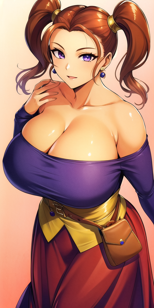 Purple_off-shoulder_shirt_Long_sleeves_Cleavage_Yellow_corset_Red_long_skirt_Belt_Pouch:她的默认服装。