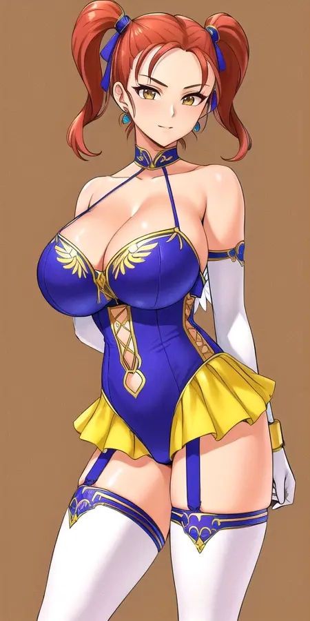 Blue_leotard_Yellow_microskirt_White_elbow_gloves_White_thighhighs_Garter_straps_Bracelet_Feathered_wings_Navel_cutout:她的性感紧身衣装扮。