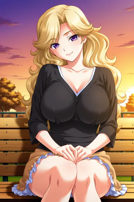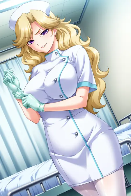 Appearence : long hair, wavy hair, swept bangs, blonde hair, purple eyes, large breasts