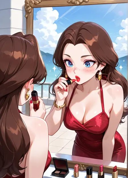 paulinexd, 1girl,jewelry, brown hair, blue eyes, long hair, earrings, makeup, lipstick, nail polish, red nails,