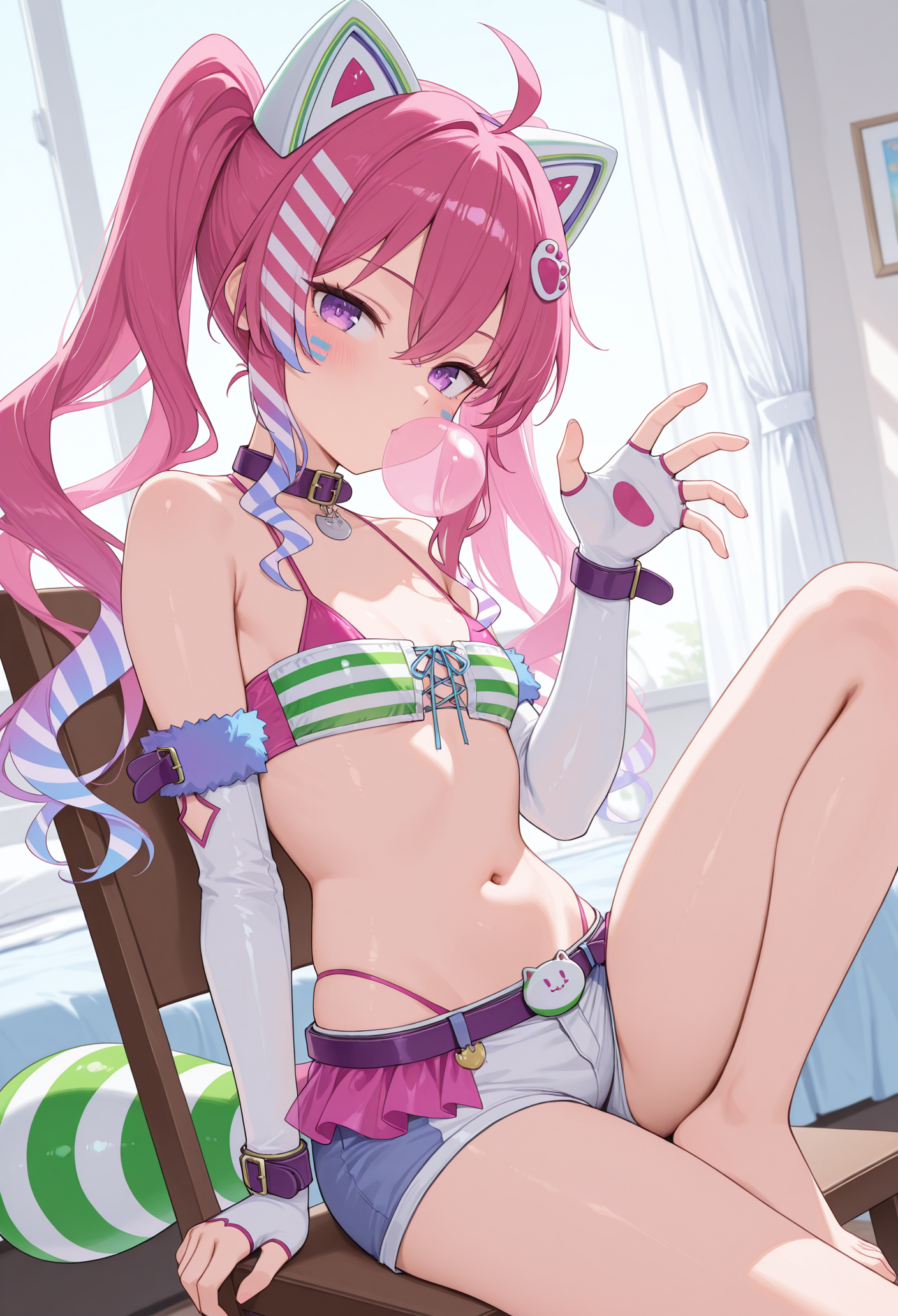 ヘアアクセサリー、水着、ビキニ、首輪、縞模様、へそ、白いショートショーツ、太ももハイソックス、肘までグローブ、指なしグローブ、ベルト