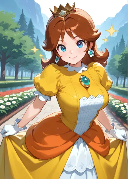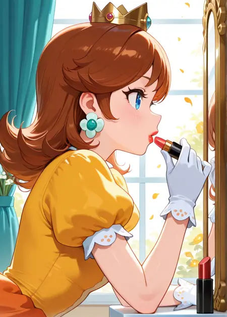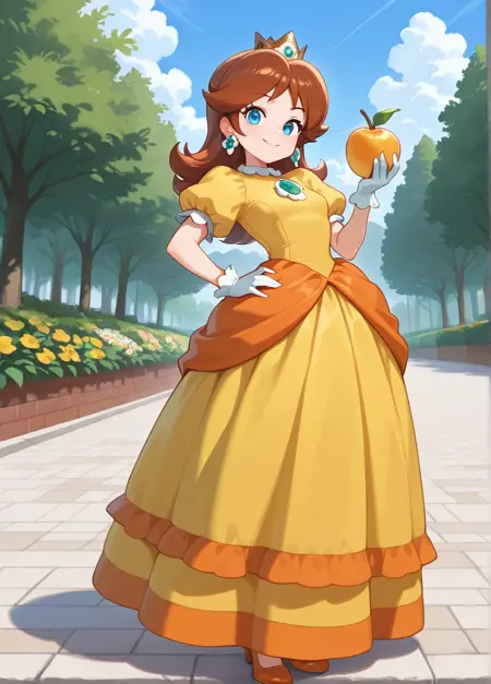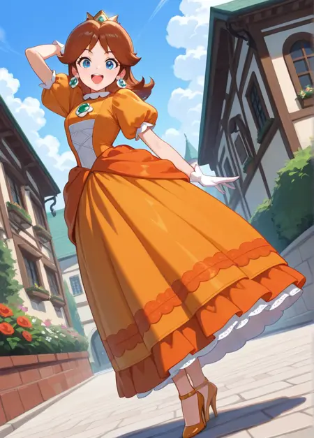 dress, gloves, earrings, crown, high heels, white gloves, puffy sleeves, orange dress, short sleeves, brooch, flower earrings,