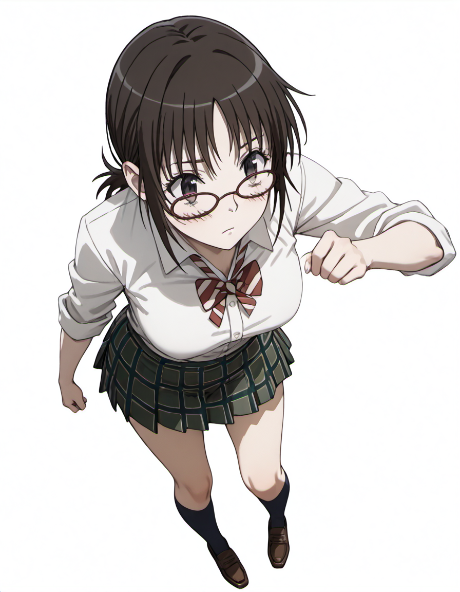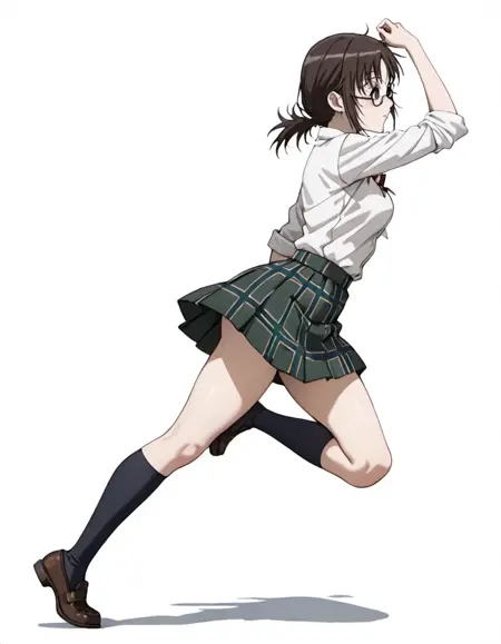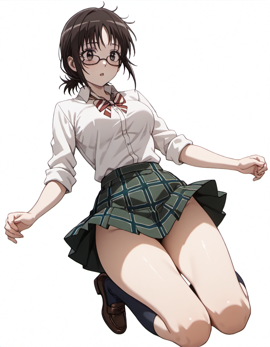 taeko_(coppelion), glasses, brown hair, ponytail, school uniform, white shirt, plaid skirt, green skirt, pleated skirt, ribbon, kneehighs, loafers,