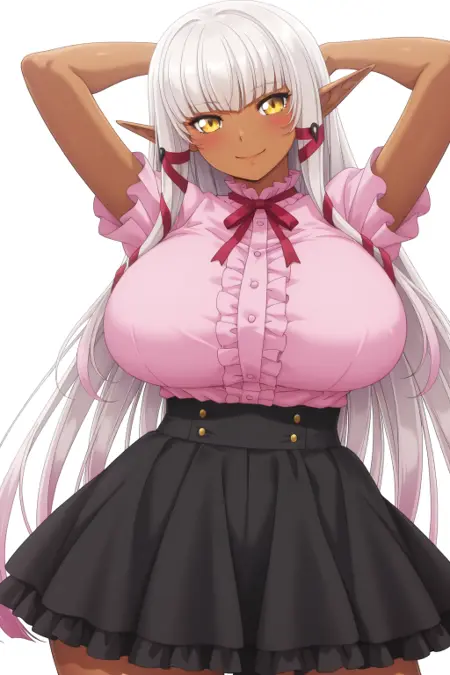 | Trained Words | YEevelyn, dark-skinned female, pointy ears, huge breasts, yellow eyes, white hair, gradient hair, long side tails, red ribbonsCopied! elbow gloves, bare shoulders, detached collar, asymmetrical legwear, thigh boot, single thighhigh, bikini thongCopied! stockings, maid outfit, apron, bonnet, maidCopied! pink shirt, black skirt, frilled skirt, frilled shirt, short sleeveCopied! |