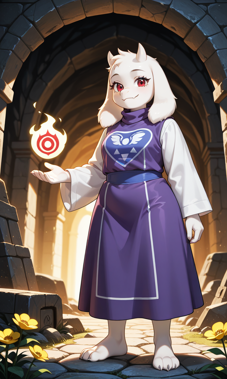 プロンプト: Toriel_(undertale), アンソロポモルフィックなヤギ, 赤い目, 睫毛, ゆるやかな耳, 小さな角