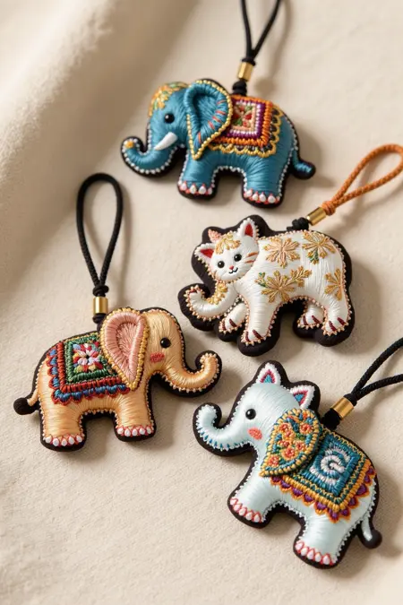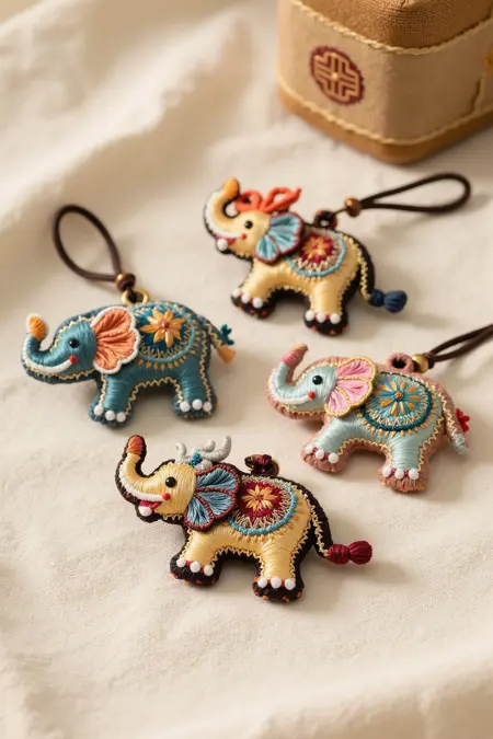 刺繍工芸品のペンダント、ドラゴンや象のようなユニークな動物の形状を特徴とし、繊細な刺繍のディテール、文化的なシンボル、優しいトーンで、お土産にふさわしいです。