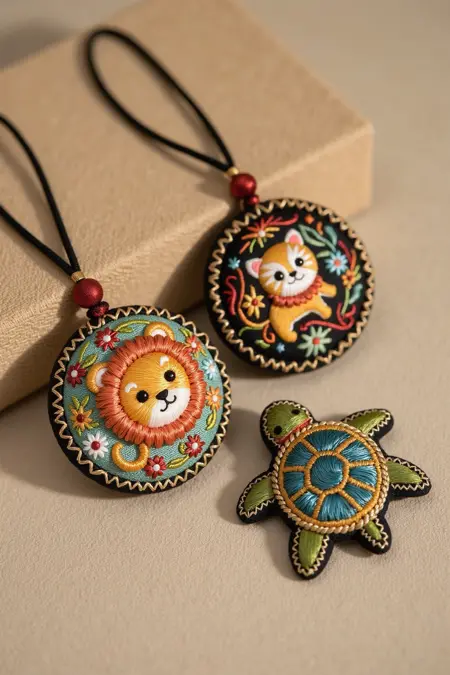 刺繍工芸品のペンダント、カメや象のような愛らしい動物の姿を表現し、繊細な刺繍ワーク、文化的な要素、優しい色合いを活かし、装飾に最適です。