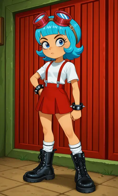 goggles on head, white shirt, suspenders, red skirt, spiked bracelet socks, boots