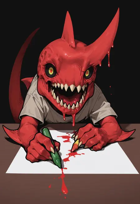 monster, colored skin, red skin, fin, arm fins, sharp teeth, claws, tail, black sclera, yellow pupils