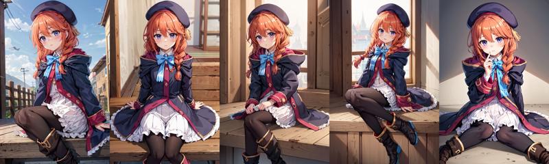 • ユニ\(プリンセスコネクト!\)、ロングヘア、ツインバッチ、前髪、目の間に髪、ベレット、フード付きコート、セントテレサ女子学園の制服、フリル付きドレス、黒いパンティーストッキング、ブーツ