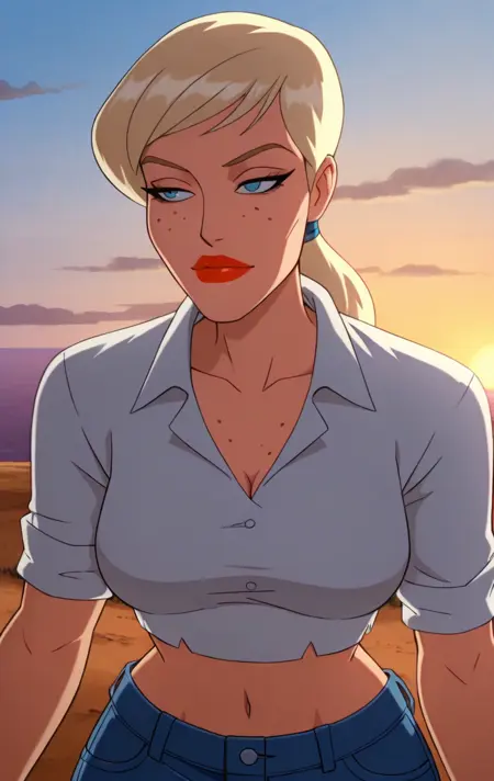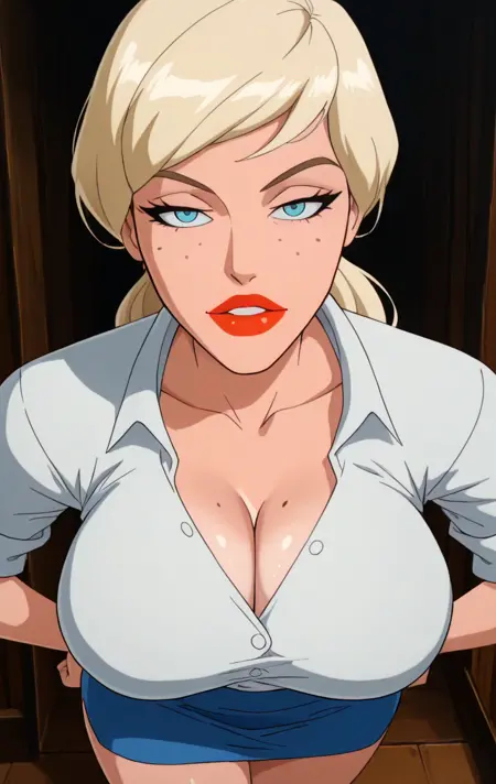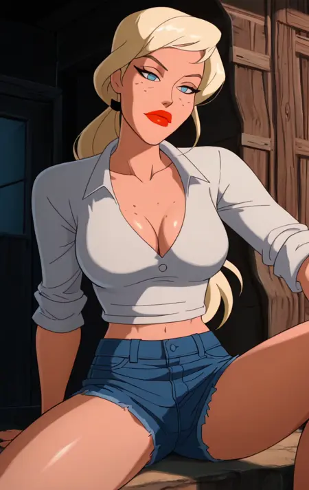 1girl, solo, long hair, looking at viewer, blue eyes, shirt, blonde hair, parted lips, red lips, freckles, denim shorts, 3mmyl0u,