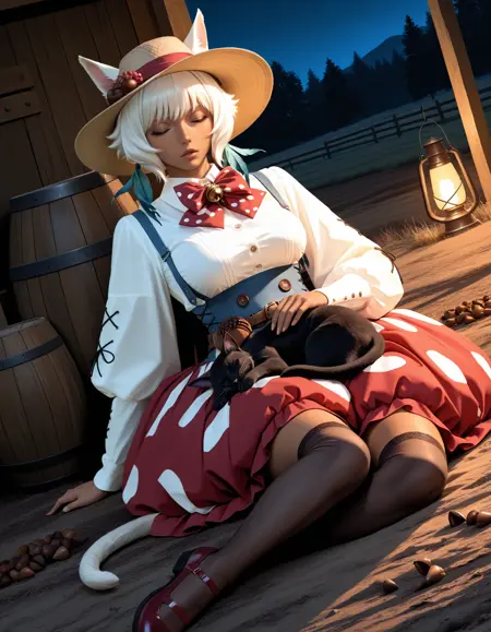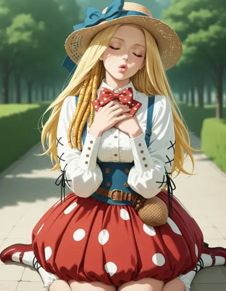 有领衬衫,蓬袖,红色裙子,波点裙子,泡泡裙,棕色草帽,十字刺绣帽子,(单个橡果包),腰带,纽扣,帽子蝴蝶结,蓝色吊带,花边袜子,白色袜子,红色玛丽珍鞋,(交叉系带袖子),波点蝴蝶结