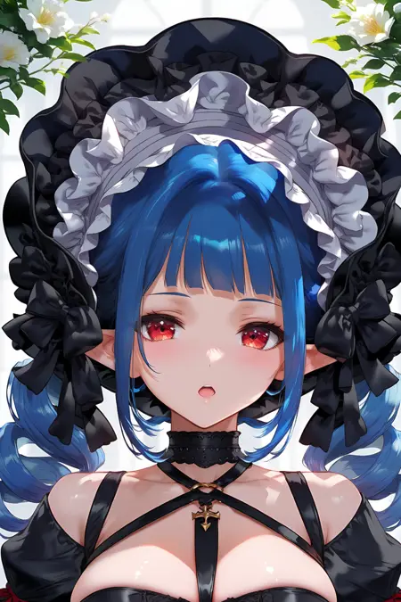 Dizzy2, 1girl, 긴 머리, 가슴, 시청자 바라보기, 뺨에 홍조, 붉은 눈, 긴 소매, 모자, 드레스, 가슴 노출, 파란 머리, 분리된 소매, 목걸이, 뾰족한 귀, 가상 유튜버, 앞머리, 둔한 앞머리, 검은 드레스, 드릴 머리, 쌍둥이 드릴, 로리타 패션, 뽀_net, 빨간 끈