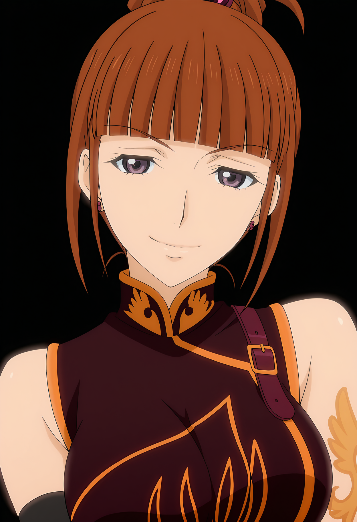 1girl, solo, eva ushiromiya, mature female, brown hair, short hair, blunt bangs, bangs, orange hair, hair bun, hair ornament, purple eyes, jewelry, earrings, tattoo, arm tattoo