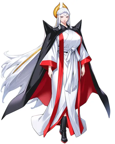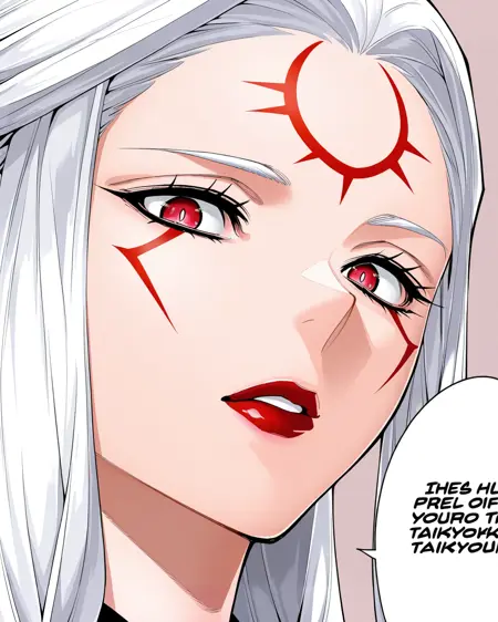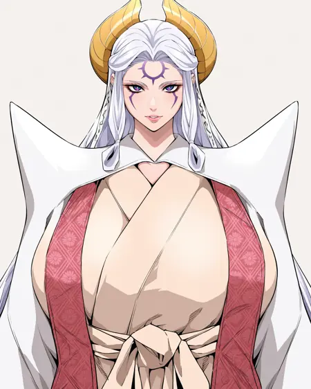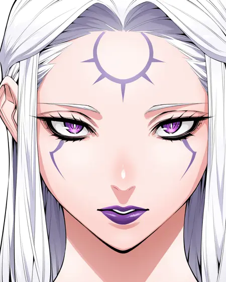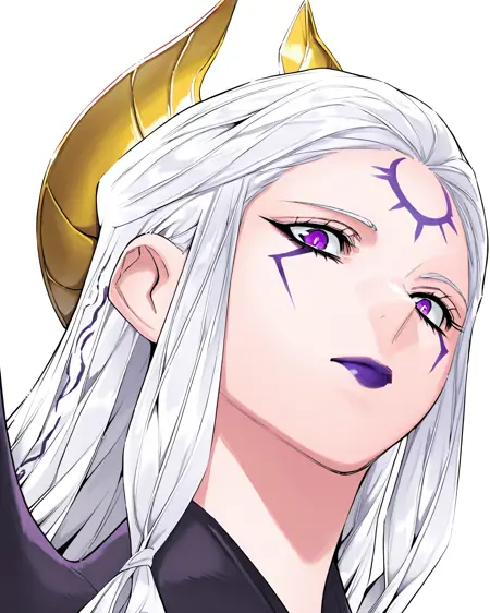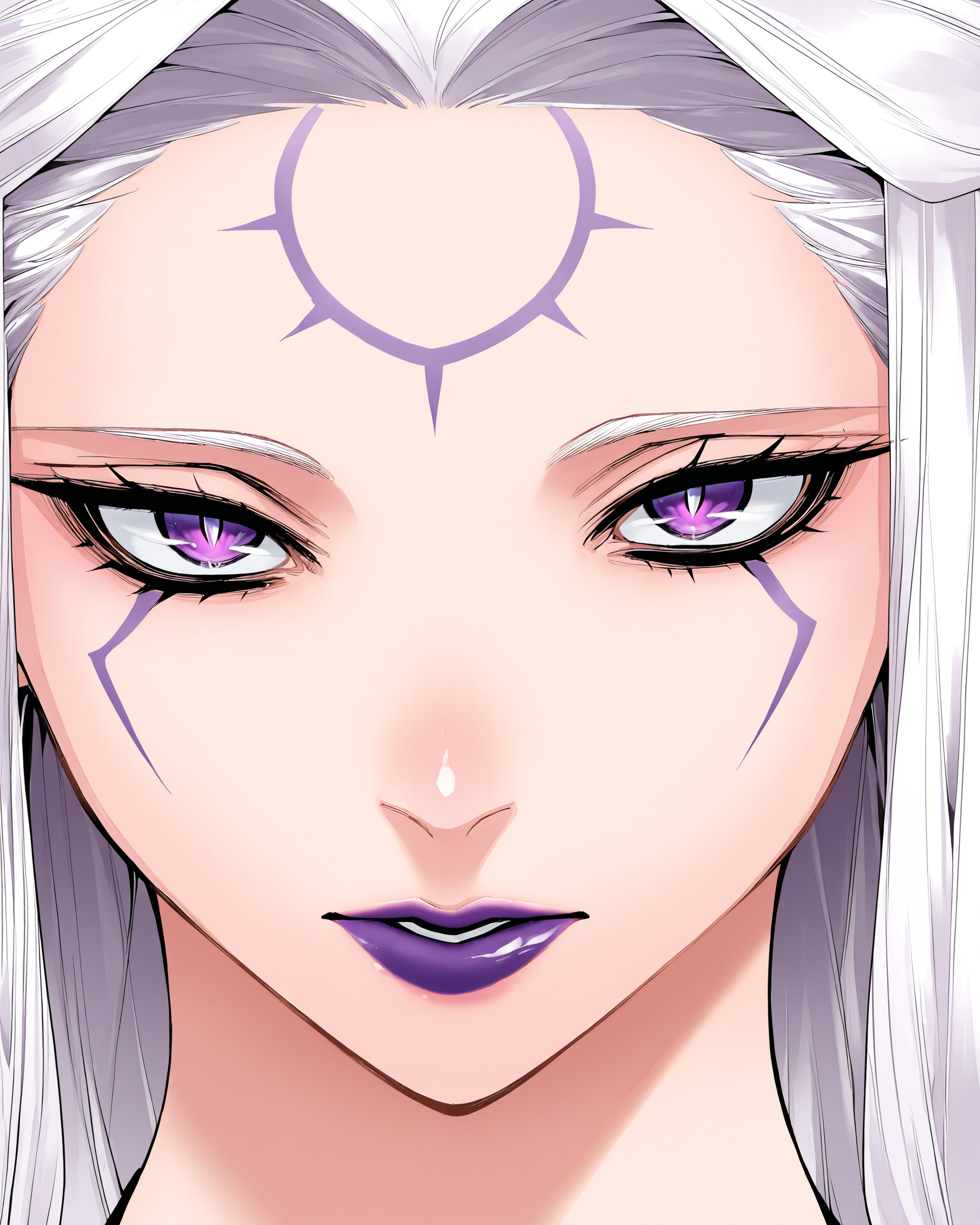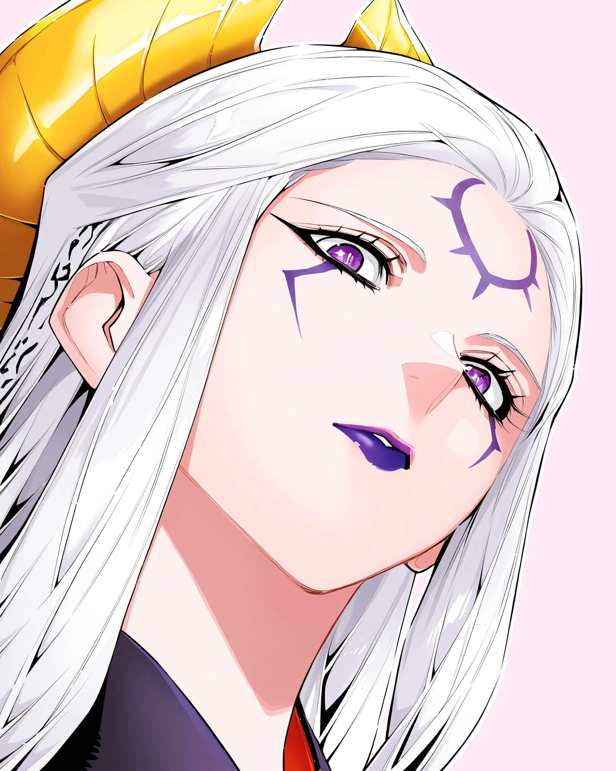 taikyoku (chained soldier),1girl,purple lips,purple eyes,solo,white hair,lipstick,facial mark,forehead mark,hair hair ornament,horns,japanese clothes,
