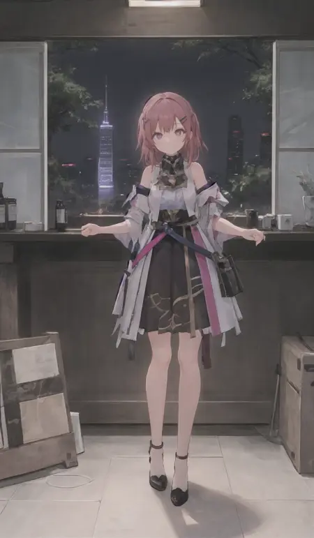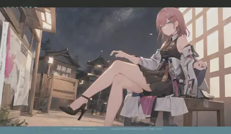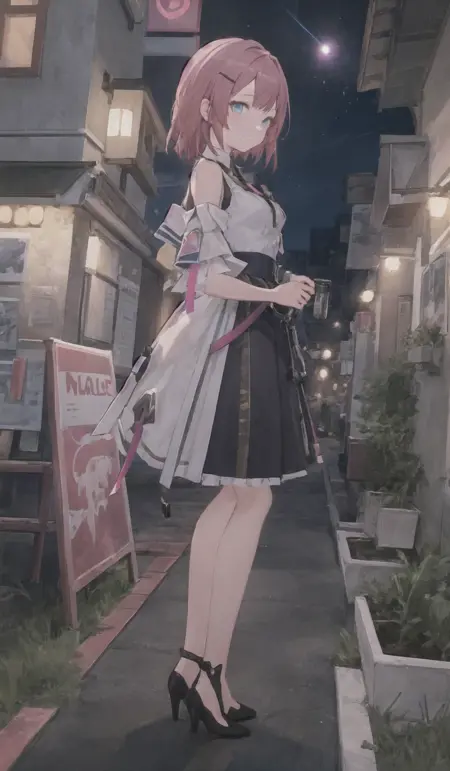 关键词:high heels, pink short hair, blue eyes, dress detached sleeves, garter, bow tie, off shoulder dress, hand lantern, membership card, asta