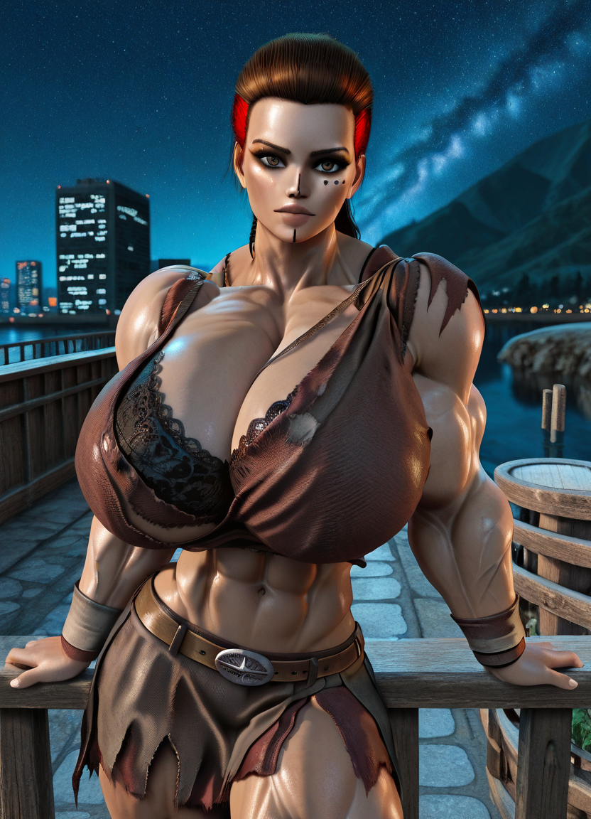 BrownBikinir_Ragna_ownwaifu, 1girl, alternate breast size, alternate muscle size, brown hair, facial tattoo, hair pulled back, leather, muscular female, torn clothes, tribal, two-tone hair, long hair, lips, huge breasts, multicolored hair, red hair, abs, biceps, cleavage, facepaint, nose, facial mark, jewelry, brown eyes, gigantic breasts, midriff, navel, armor, braid, collarbone, dark skin, thighs, veins, wristband, bra, dark-skinned female, makeup, obliques, skirt, 3d, bare shoulders, belt, black bra, crop top, dreadlocks, thick arms, toned, veiny arms,
