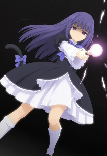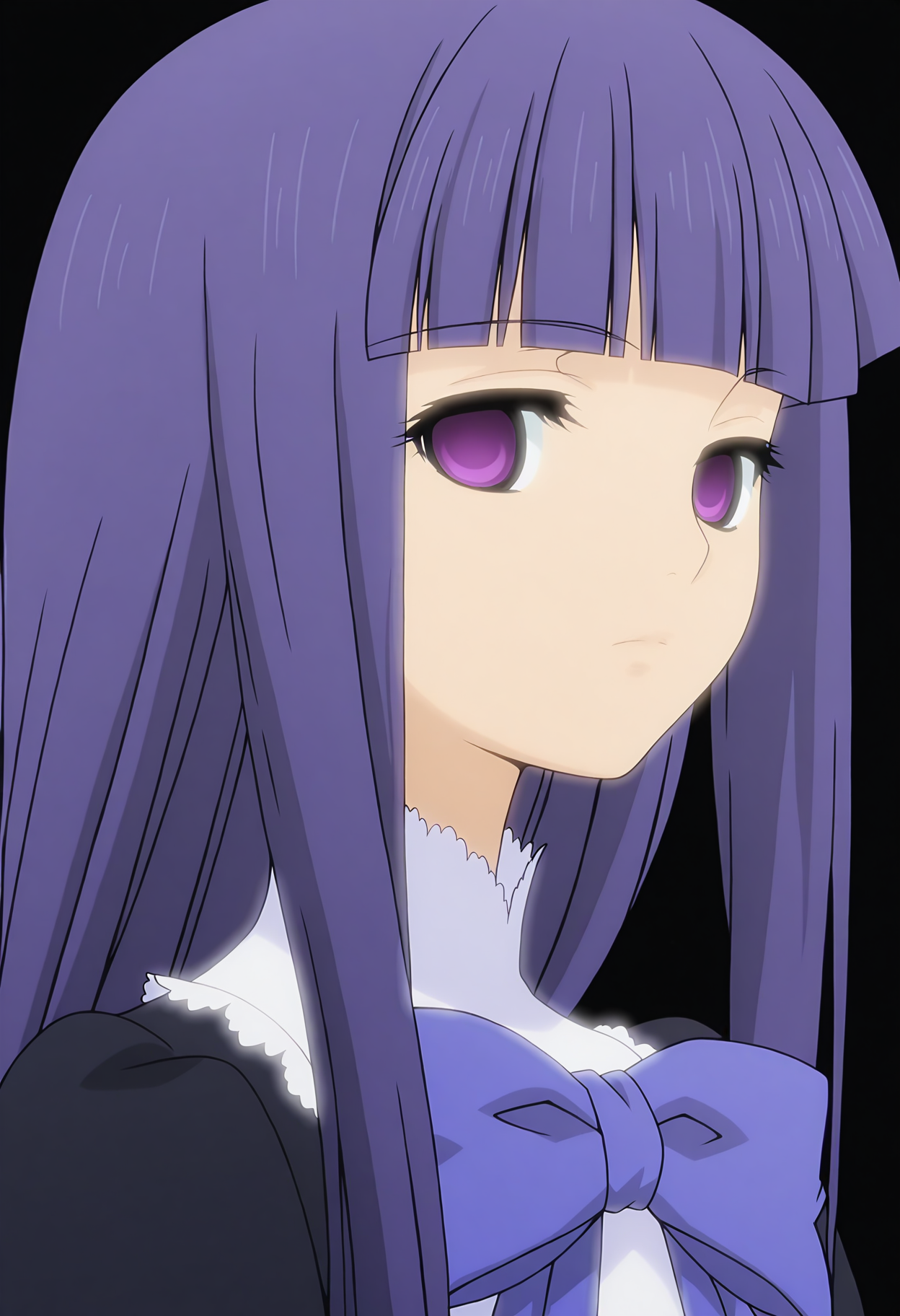 1girl, solo, frederica bernkastel, long hair, blue hair, purple eyes, empty eyes, purple hair, bangs, blunt bangs, expressionless