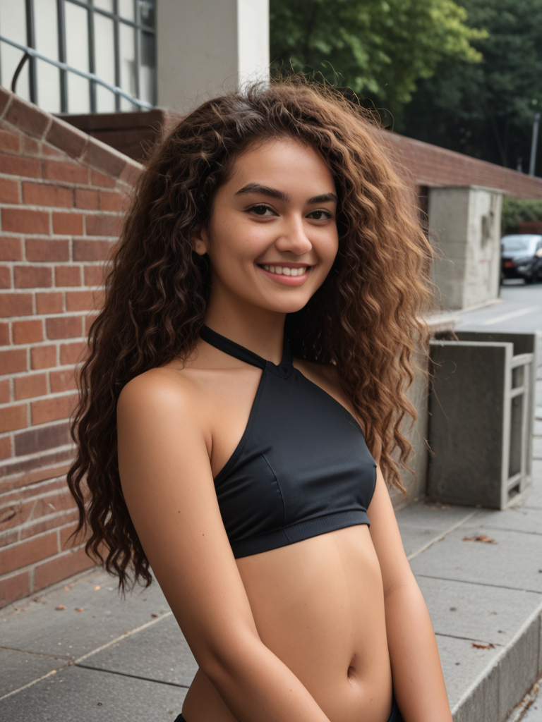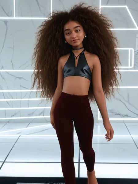 Woman, wild hairstyle, long hair, reddish brown hair, black halter top, black heels, burgundy leggings, brown skin