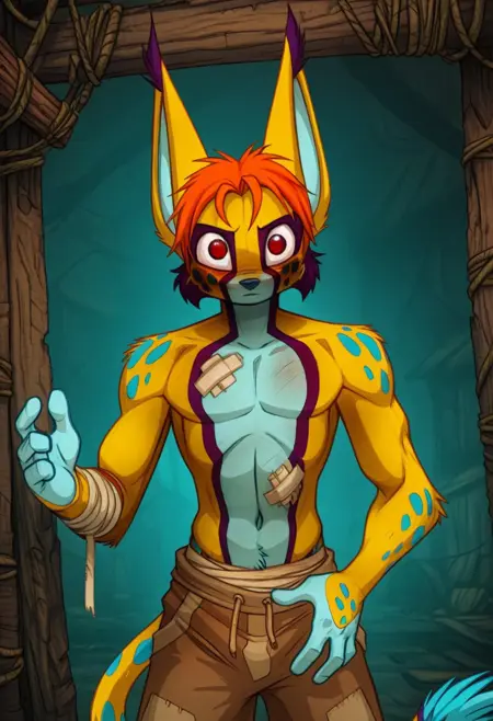 bob_fred_dk, 1boy, solo, furry, furry male, animal ears, animal nose, orange hair, male focus, red eyes, short hair, tail, colored skin, body fur, snout, two-tone fur, yellow fur