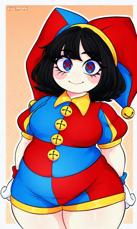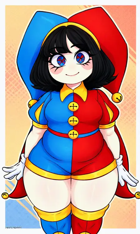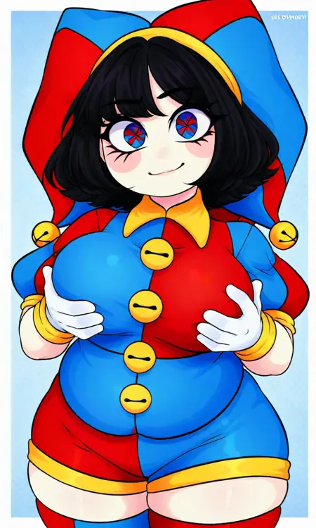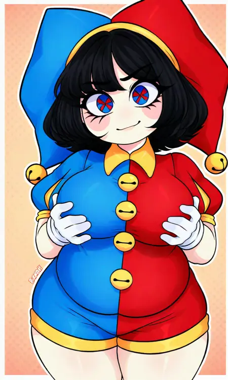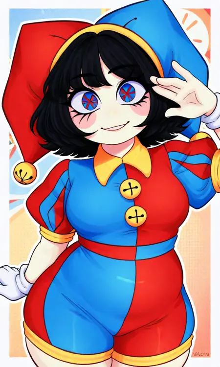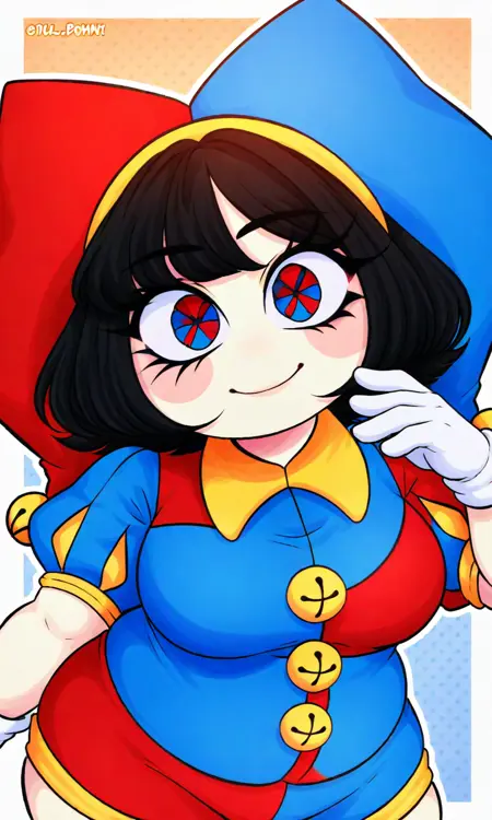 태그: hail_pomni, 흰 피부, 뺨 스티커, 파란-빨간 동공, 기호 모양 동공, 갈색 머리, 광대 복장, 종, 광대 모자, 흰 장갑, 파란 신발, 빨간 신발, 어울리지 않는 옷차림, 통통한 체형