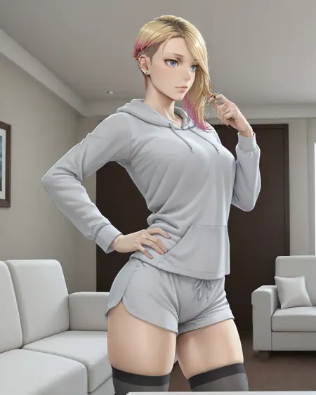 蜘蛛宇宙·卸下面具: Gw3nv3rs3,1女孩,蓝眼睛,金发,多色头发,不对称发型,剃边发型,嘴唇,穿孔,连帽紧身衣,连帽,蜘蛛网图案,紧身,手套,芭蕾舞鞋