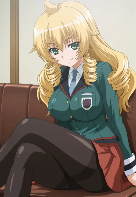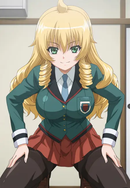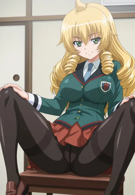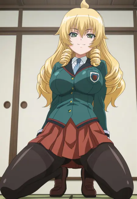 标签词:金色头发,长发,钻头发,呆毛,绿眼睛,校服,校徽,西装外套,白衬衫,裙子,红色裙子,领带,蓝色领带,丝袜,黑色丝袜,大腿带丝袜,丝袜下内裤,裆部接缝,白色内裤,乐福鞋,戒指,嘴唇