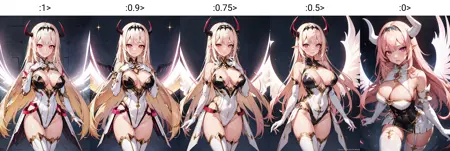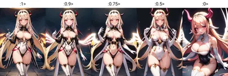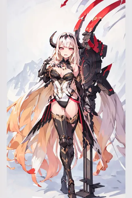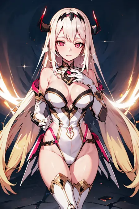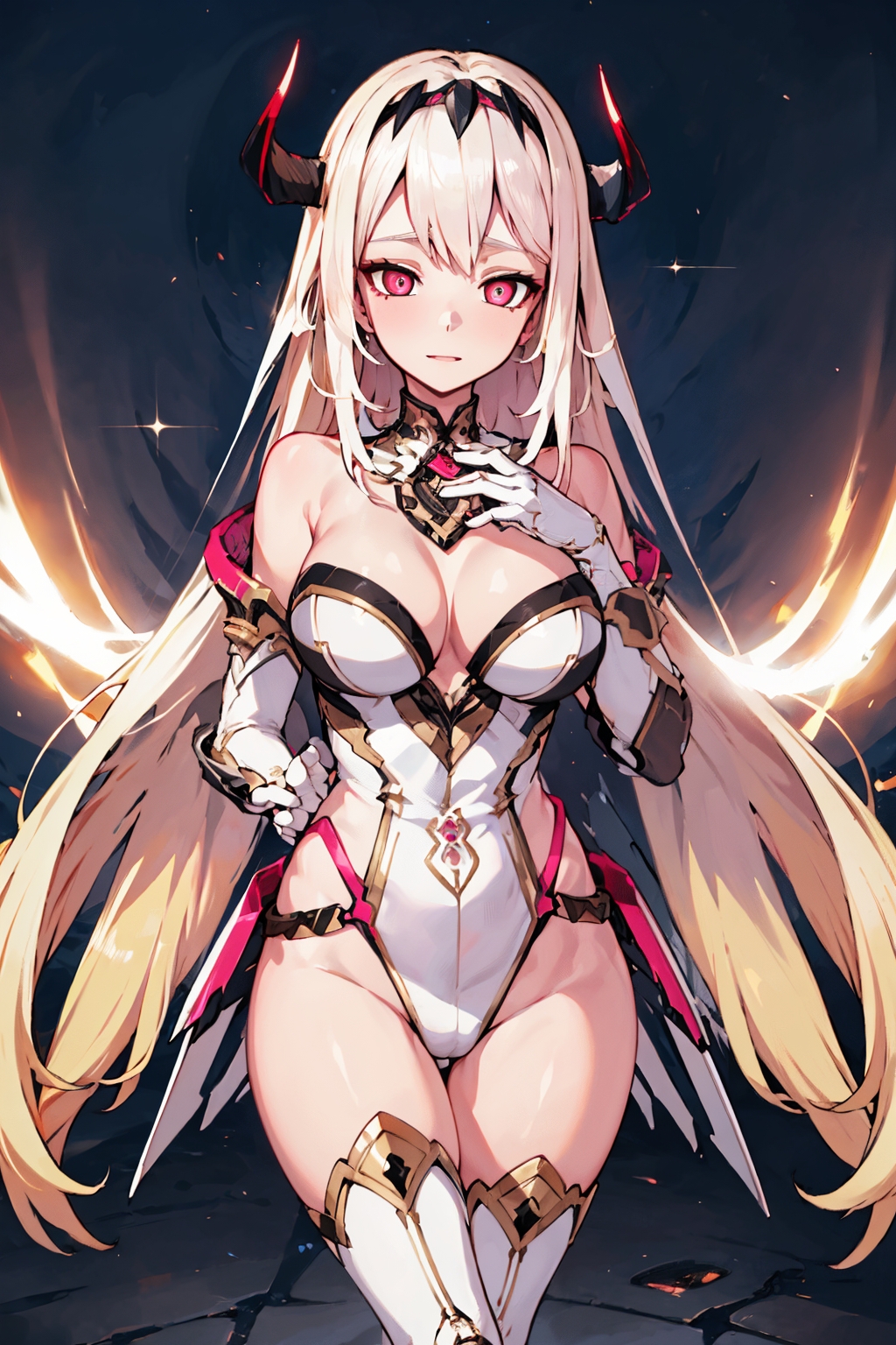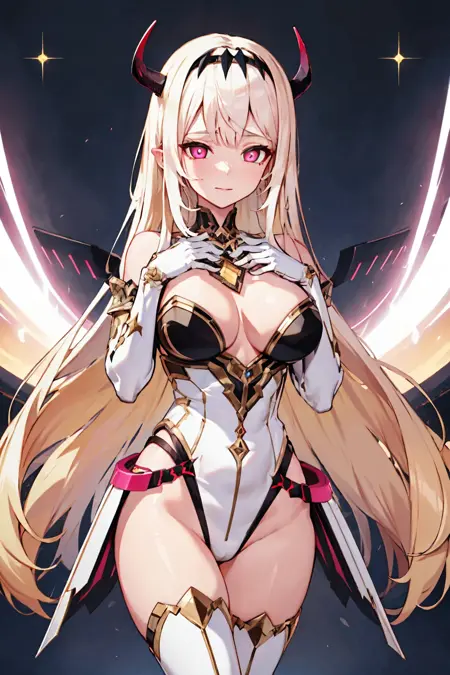 ヘアバンド、角、非常に長い髪、浮遊する髪、ピンクの髪、金髪、グレーの髪、グラデーションの髪、複色の髪、明るい瞳、白い瞳、赤い目、赤いアイシャドウ、肩出し、取り外し可能な袖、白い手袋、肘までの手袋、ジュエリー、胸元、中程度の胸、衣装の切り抜き、ハイレグレオタード、ショーガールスカート、メカニカルスカート、白い太ももまでの靴下、エネルギーの翼、光る翼、メカニカルな翼,