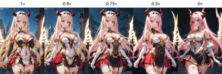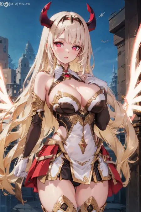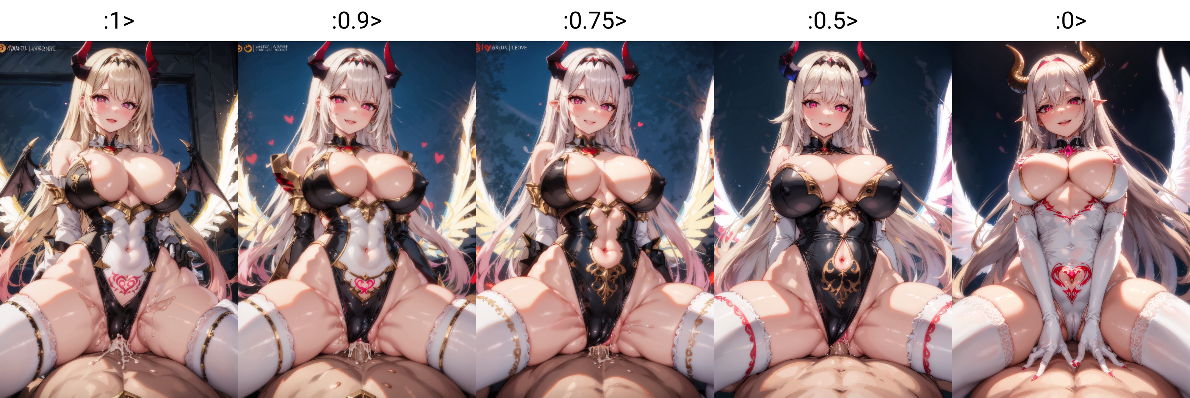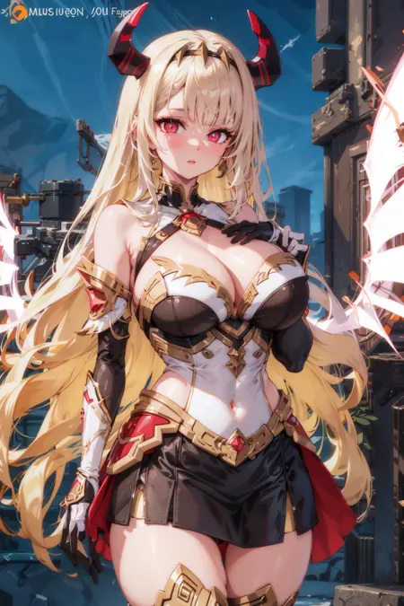 hairband, horns, very long hair, floating hair, pink hair, blonde hair, grey hair, gradient hair, multicolored hair, bright pupils, white pupils, red eyes, red eyeshadow, bare shoulders, detached sleeves, white gloves, elbow gloves, jewelry, cleavage, medium breasts, clothing cutout, highleg leotard, showgirl skirt, mechanical skirt, white thighhighs, energy wings, glowing wings, mechanical wings,