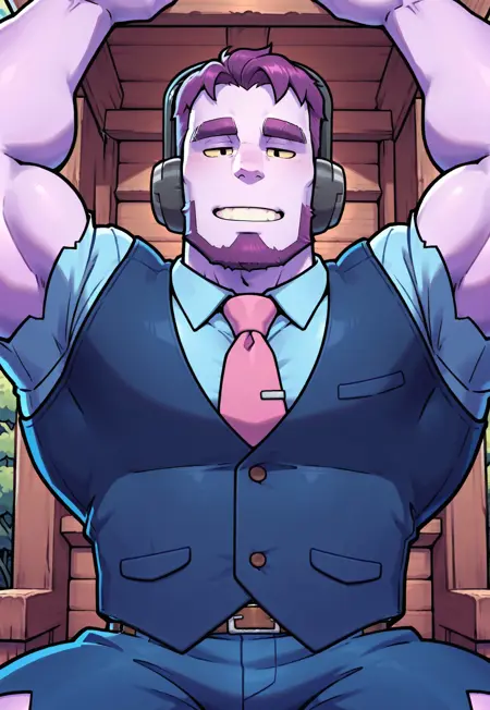 提示词:Fr4nkBS, 1boy, solo, 仅男性, 男性焦点, bara, 成熟男性, 紫色皮肤, 紫色头发, 短发, 半闭眼睛, 黄色眼白, 黑色眼睛, 耳机, 露齿笑, 肌肉发达, 大胸肌, 大手臂, 蓝色衬衫, 蓝色背心, 领带, 破旧衣物, 短裤